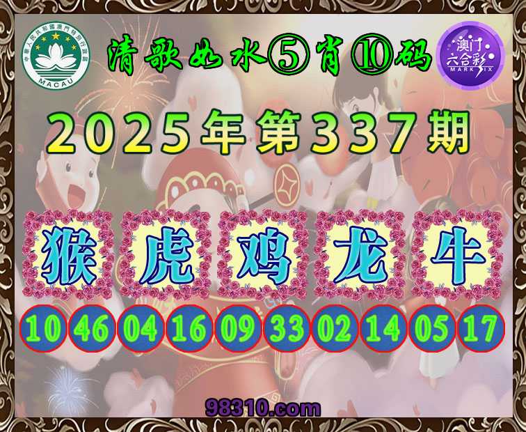 337期:【清歌如水】 ⑤肖⑩码【猴虎鸡龙牛】开:鸡09准
